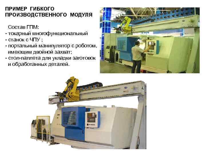 ПРИМЕР ГИБКОГО ПРОИЗВОДСТВЕННОГО МОДУЛЯ Состав ГПМ: - токарный многофункциональный - станок с ЧПУ ; - портальный манипулятор с роботом, имеющим двойной захват; - стол-паллета для укладки заготовок и обработанных деталей.