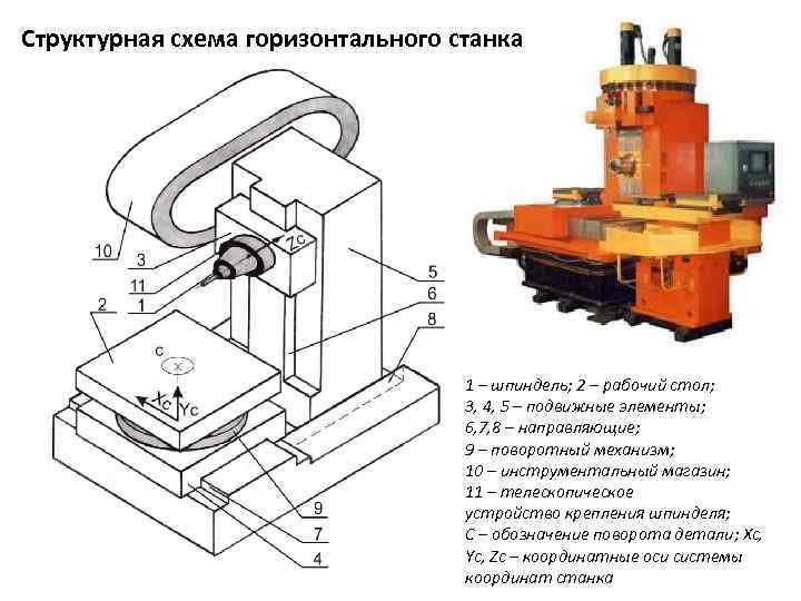 Структурная схема горизонтального станка 1 – шпиндель; 2 – рабочий стол; 3, 4, 5 – подвижные элементы; 6, 7, 8 – направляющие; 9 – поворотный механизм; 10 – инструментальный магазин; 11 – телескопическое устройство крепления шпинделя; С – обозначение поворота детали; Xc, Yc, Zc – координатные оси системы координат станка