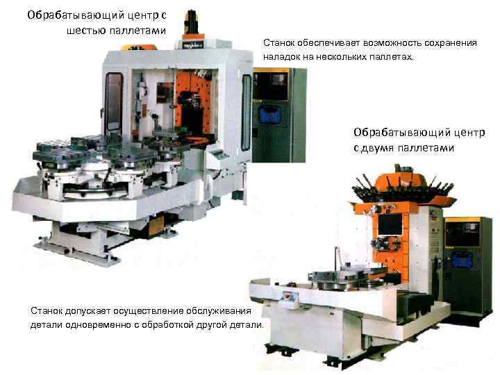 Обрабатывающий центр с шестью паллетами Станок обеспечивает возможность сохранения наладок на нескольких паллетах. Обрабатывающий центр с двумя паллетами Станок допускает осуществление обслуживания детали одновременно с обработкой другой детали.