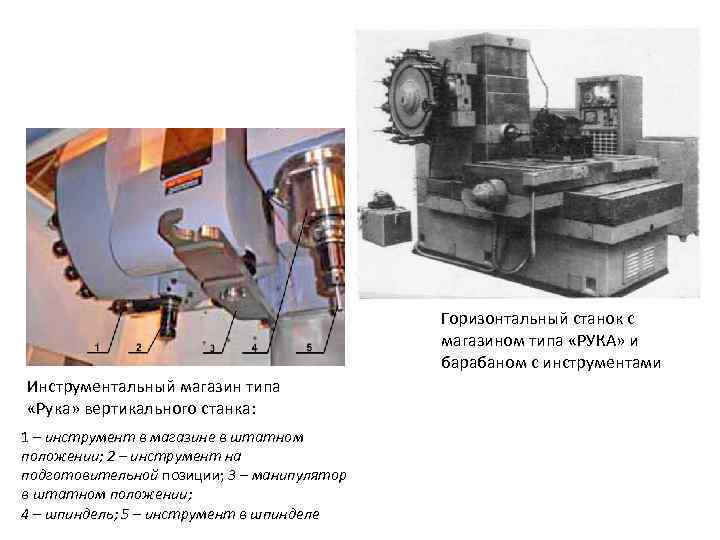 Горизонтальный станок с магазином типа «РУКА» и барабаном с инструментами Инструментальный магазин типа «Рука» вертикального станка: 1 – инструмент в магазине в штатном положении; 2 – инструмент на подготовительной позиции; 3 – манипулятор в штатном положении; 4 – шпиндель; 5 – инструмент в шпинделе
