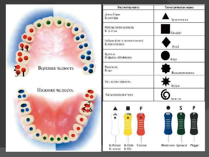 Стандартизация эндодонтических инструментов Для удобства работы с эндодонтическими инструментами, по ISO (Международная система стандартов) было принята следующая совокупность вариантов кода. Цифровая кодировка эндодонтических инструментов (от 6 и до 140), которая наносится непосредственно на ручку или на фабричную упаковку эндодонтического инструмента и соответствует диаметру инструмента. Например, номер 6 соответствует диаметру 0, 06 мм. Геометрическая кодировка эндодонтических инструментов (круг, треугольник, квадрат, спираль, восьмиугольник), которая отображает поперечное сечение рабочей части эндодонтического инструмента. Цветовая кодировка эндодонтических инструментов состоит из 6 и основных и трех промежуточных цветов. При расширении канала ни один цвет не должен быть пропущен!