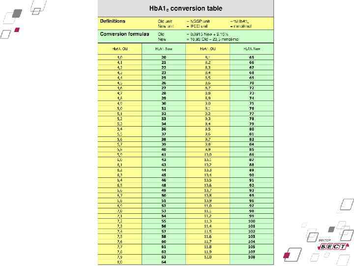 Новый диагностический критерий – гликозилированный гемоглобин (Hb. A 1 c) В 2011 г. ВОЗ одобрила возможность использования Hb. A 1 c для диагностики СД. В качестве диагностического критерия СД выбран уровень Hb. A 1 c ≥ 6, 5 % (48 ммоль/моль). Нормальным считается уровень Hb. A 1 c до 6, 0 % (42 ммоль/моль).