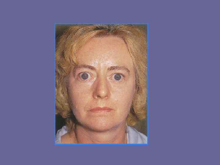 Клинические проявления тиреотоксикоза Изменения со стороны глаз • Блеск глаз, редкое мигание (1 -2 мигания в минуту)симптом Штельвага • Расширение глазных щелей, что создает впечатление удивленного или испуганного взгляда • При взгляде вниз между верхним веком и радужной оболочкой появляется участок склеры- ретракция верхнего века, симптом Грефе • При взгляде вверх также обнаруживается участок склеры между нижним веком и радужкой -отставание нижнего века, симптом Кохера • Нарушение конвергенции глазных яблок- симптом Мебиуса • При взгляде прямо выявляется полоска склеры между верхним веком и радужной оболочкой- симптом Дальримпля Глазные симптомы связаны с нарушением иннервации глазодвигательных мышц