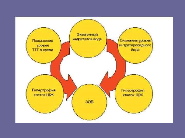 амиодарон Аутоиммунный тиреоидит Нарушение органификации иода Стимуляция тироидного аутоиммунитета гипотиреоз Проживание в иоддефицитном районе Активация автономных участков Щ. Ж. тиротоксикоз Деструкция клеток Щ. Ж. Иодиндуцированный зоб