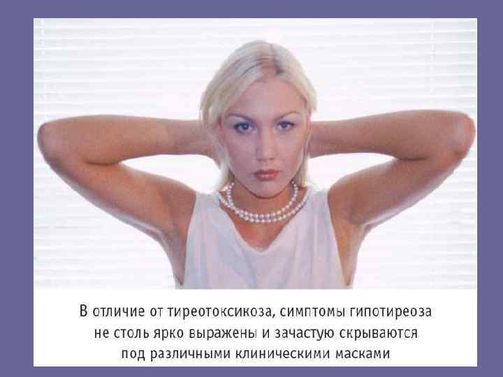 Причины гипотиреоза • Хронический аутоиммунный тиреоидит (атрофическая и гипертрофическая форма)-80 -90% • Йодная недостаточность (в эндемичных районах) • Операции на щитовидной железе (субтотальная и тотальная тироидэктомия)- 6 -8% • Применение препаратов, обладающих антитероидным воздействием (кордарон (4%), тиростатики, литий (1, 5%), йодсодержащие препараты (2%)) • Применение 131 I с лечебной целью (гипертиреоз и др. ) • Рентгенотерапия и другие виды внешнего облучения по поводу злокачественных опухолей, расположенных в области головы и шеи • Инфильтративные заболевания щитовидной железы (амилоидоз, склеродермия) • Поражение на уровне гипоталамо-гипофизарной области (опухоли, облучение, сосудистые нарушения)