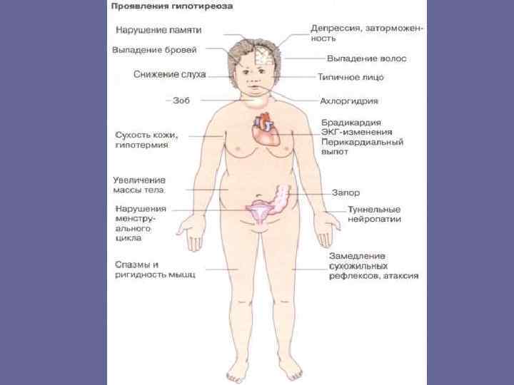 Желудочно – кишечный тракт Клинические проявления • Прибавка массы тела при сниженном аппетите • «Ленивый ЖКТ» - псевдонепроходимость кишечника (замедленное опорожнение желудка и кишечника, тошнота, рвота), запор • Атрофический гастрит • Замедление кишечной абсорбции пищи (например, снижение всасывания железа, фолиевой кислоты, витамина В 12, что приводит к анемии) • Может сочетаться с билиарным циррозом, желчнокаменной болезнью, дискинезией желчевыводящих путей