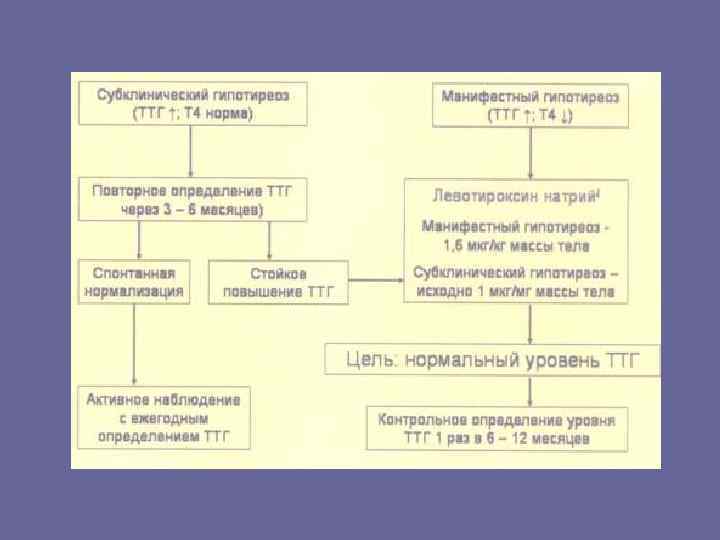 Содержание ТТГ в сыворотке крови, м. Ед/л ТТГ <0, 4 Возможен гипертиреоз Св. Т 4 в норме 0, 4 -4 м. МЕ/л 4 -10 >10 Эутиреоз Возможен гипотиреоз Манифестный гипотиреоз Св. Т 4 повышен Субклинический Манифестный гипертиреоз Св. Т 4 в норме Субклинический гипотиреоз Св. Т 4 снижен Манифестный гипотиреоз