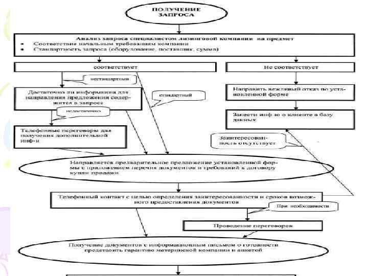 1. 2. 3. 4. 5. 6. 7. 8. Пользователь (лизингополучатель) заказывает необходимое оборудование. Лизингодатель оплачивает по договору купли-продажи заявленное имущество его изготовителю или поставляет лизингополучателю имеющееся ранее использованное оборудование. Лизингополучатель запрашивает лизингодателя о наличии необходимого оборудования и основных условиях лизингового договора, одновременно предоставляет документы, характеризующие финансовое состояние и производственные возможности арендатора (бизнес-план проекта и другие документы). Подписание лизингового контракта. Страхование объекта лизинга осуществляет одна из сторон по соглашению. Изготовитель (собственник) поставляет объект лизинга арендатору и по соглашению сторон может осуществлять техническое обслуживание и ремонт оборудования. Лизингополучатель осуществляет лизинговые платежи. Лизингополучатель возвращает объект сделки в связи с окончанием срока аренды (лизингового договора).