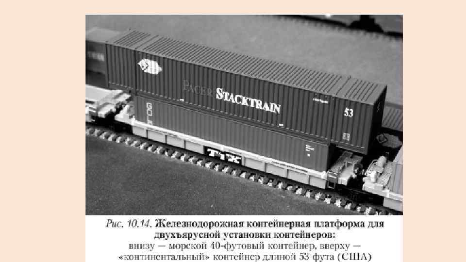 Технические средства контейнерной ТТС подвижной состав транспорта, к которому относят ся железнодорожные вагоны, суда, автотягачи и автоприцепы • Для перевозки грузовых контейнеров на железнодорожном транспорте используют фитинговые платформы — специализиро ванные платформы, оборудованные узлами для крепления кон тейнеров (фитинговыми упорами).