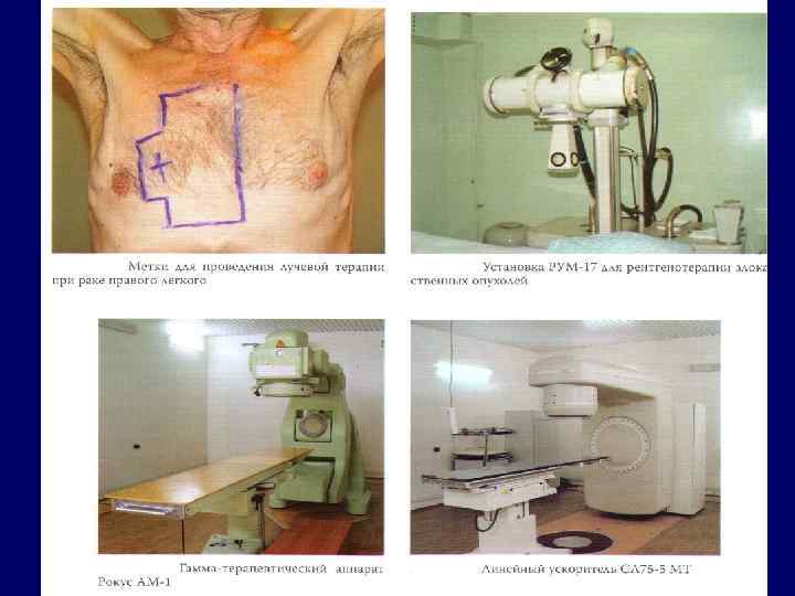 Лучевая терапия • Чувствительность опухоли к ионизирующему излучению зависит от гистологического строения и степени дифференцировки клеток. • Эффективность лучевого лечения повышается при сочетании облучения с гипертермией, обогащением кислородом, введением некоторых химиопрепаратов.