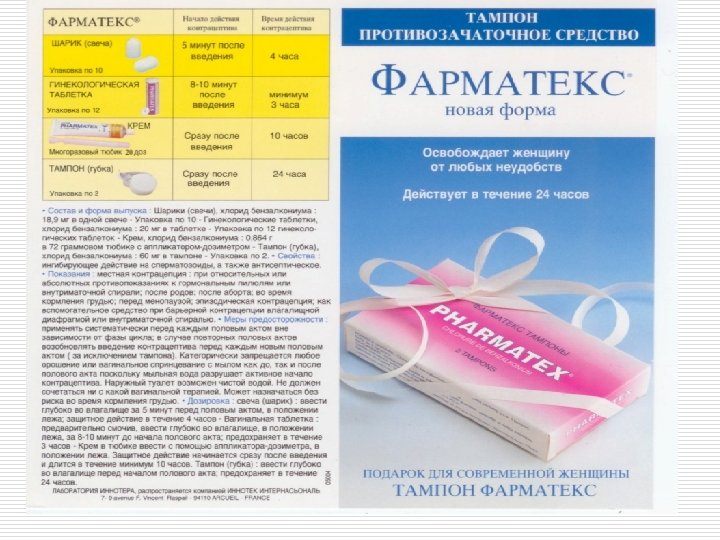Механизм действия: o Разрушение мембраны сперматозоидов, что снижает их подвижность и способность оплодотворить яйцеклетку o Недостатки спермицидов: o Невысокая контрацептивная эффективность o Контрацептив вводится за 10 -15 минут до полового акта o Каждое введение эффективно в течение 2 -6 часов (губка – 24 часа)