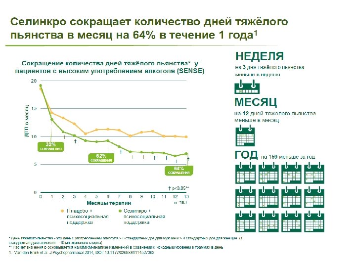 Многие пациенты выбирают сокращение в качестве цели терапии Почти половина пациентов предпочитает сокращение употребления алкоголя полному отказу от него в качестве основной цели терапии 3 46% ВЫБИРАЮТ СОКРАЩЕНИЕ 3 Хотя полный отказ от алкоголя самый безопасный путь, не все пациенты желают или способны принять этот выбор1, 2 54% ВЫБИРАЮТ ПОЛНЫЙ ОТКАЗ 3 1. Gastfriend et al. J Subst Abuse Treat 2007; 33: 71– 80 2. NICE National Clinical Practice Guidelines 115, 2011. Alcohol-use disorders. Diagnosis, assessment and management of harmful drinking and alcohol dependence. Page 174 3. Heather et al. Alcohol & Alcoholism 2010; 45(2): 128– 135
