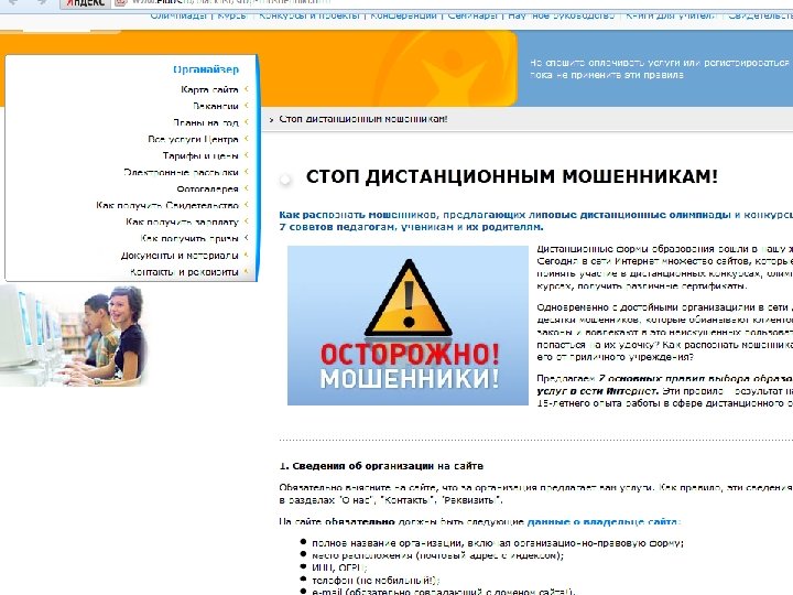 Правило № 3 Узнайте, кто является руководителем организации, предоставляющей услуги, есть ли у него педагогическое образование, учёная степень. • На сайте обязательно должны быть указаны фамилия, имя и отчество руководителя, а также его должность, образовательный ценз, учёная степень. • Полезно выяснить послужной список руководителя: есть ли у него педагогическое образование, или это просто случайный в образовании человек. • Если сайт вообще не содержит данных о руководителе, предлагающем услуги, это верный признак, что здесь что-то нечисто. Порядочные и законопослушные руководители не скрывают себя от клиентов. • Поразительно, но факт! За приличным, на первый взгляд, сайтом, который объявляет педагогический конкурс, может скрываться обыкновенный старшеклассник, у которого за душой нет ничего, кроме мобильного телефона для принятия взносов. В се'ти такого бессовестного подростка, как ни странно, попадаются даже умудрённые педагоги.