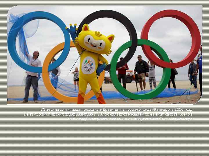 31 летняя олимпиада проходит в Бразилии, в городе Рио-де-Жанейро, в 2016 году. На этих олимпийских играх разыграны 307 комплектов медалей по 41 виду спорта. Всего в олимпиаде выступили около 11 000 спортсменов из 206 стран мира.