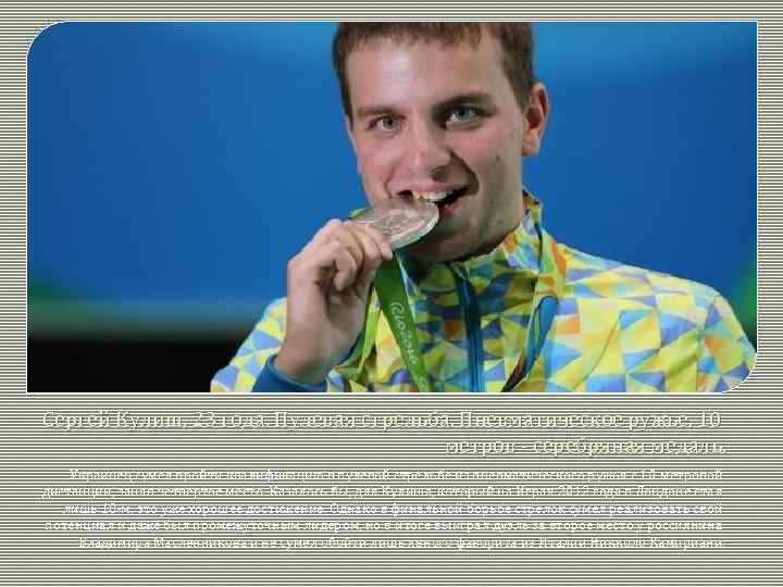 Сергей Кулиш, 23 года. Пулевая стрельба. Пневматическое ружье, 10 метров - серебряная медаль. Украинец сумел пройти квалификацию в пулевой стрельбе из пневматического ружья с 10 -метровой дистанции, заняв четвертое место. Казалось бы, для Кулиша, который на Играх-2012 года в Лондоне стал лишь 18 -м, это уже хорошее достижение. Однако в финальной борьбе стрелок сумел реализовать свой потенциал и даже был промежуточным лидером, но в итоге выиграл дуэль за второе место у россиянина Владимира Масленникова и не сумел обойти лишь явного фаворита из Италии Никколо Камприани.