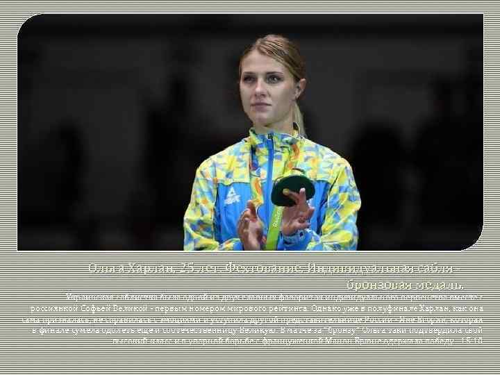 Ольга Харлан, 25 лет. Фехтование. Индивидуальная сабля - бронзовая медаль. Украинская саблистка была одной из двух главных фавориток индивидуального первенства вместе с россиянкой Софьей Великой - первым номером мирового рейтинга. Однако уже в полуфинале Харлан, как она сама призналась, не справилась с эмоциями и уступила другой представительнице России - Яне Егорян, которая в финале сумела одолеть еще и соотечественницу Великую. В матче за "бронзу" Ольга таки подтвердила свой высокий класс и в упорной борьбе с француженкой Манон Брюне одержала победу - 15: 10.