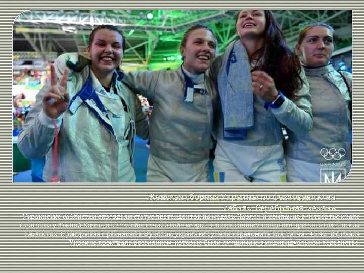 Женская сборная Украины по фехтованию на саблях. Серебряная медаль Украинские саблистки оправдали статус претенденток на медаль. Харлан и компания в четвертьфинале выиграли у Южной Кореи, а затем обеспечили себе медаль в напряженном поединке против итальянских саблисток. Проигрывая с разницей в 8 уколов, украинки сумели переломить ход матча - 45: 42. В финале Украина проиграла россиянкам, которые были лучшими и в индивидуальном первенстве.