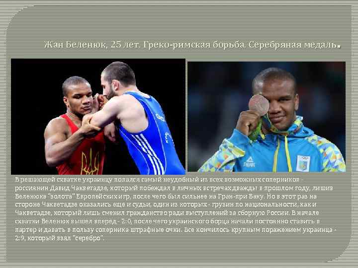 . Жан Беленюк, 25 лет. Греко-римская борьба. Серебряная медаль В решающей схватке украинцу попался самый неудобный из всех возможных соперников - россиянин Давид Чакветадзе, который побеждал в личных встречах дважды в прошлом году, лишив Беленюка "золота" Европейских игр, после чего был сильнее на Гран-при Баку. Но в этот раз на стороне Чакветадзе оказались еще и судьи, один из которых - грузин по национальности, как и Чакветадзе, который лишь сменил гражданство ради выступлений за сборную России. В начале схватки Беленюк вышел вперед - 2: 0, после чего украинского борца начали постоянно ставить в партер и давать в пользу соперника штрафные очки. Все кончилось крупным поражением украинца - 2: 9, который взял "серебро".