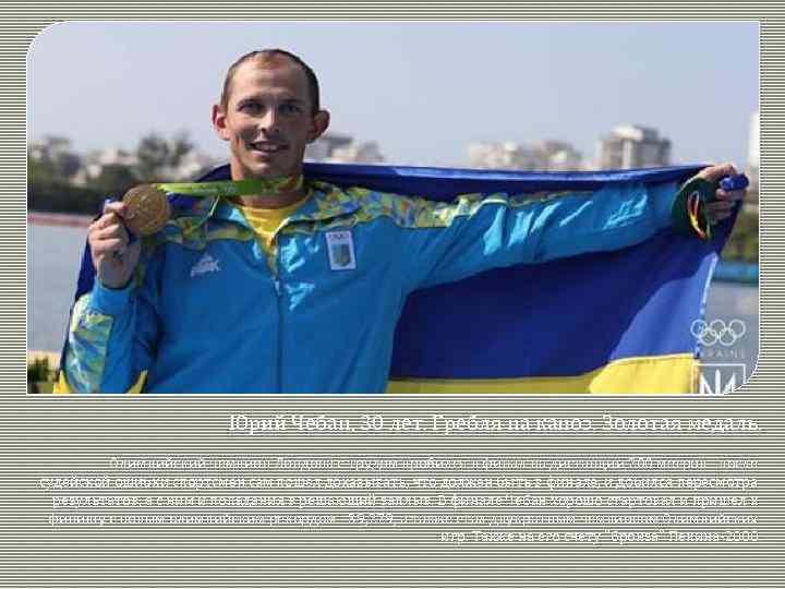Юрий Чебан, 30 лет. Гребля на каноэ. Золотая медаль. Олимпийский чемпион Лондона с трудом пробился в финал на дистанции 200 метров - после судейской ошибки спортсмен сам пошел доказывать, что должен быть в финале, и добился пересмотра результатов, а с ним и попадания в решающий заплыв. В финале Чебан хорошо стартовал и пришел к финишу с новым олимпийским рекордом - 39, 279, а также стал двукратным чемпионом Олимпийских игр. Также на его счету "бронза" Пекина-2008.