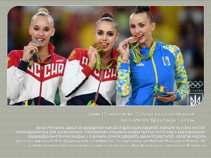 Анна Ризатдинова, 23 года. Художественная гимнастика. Бронзовая медаль Анна считалась одной из фавориток еще до старта соревнований, поэтому ее успех не стал неожиданностью для болельщиков. Ризатдинова уверенно заняла третье место еще в квалификации индивидуального многоборья, а в финале сумела удержать данный результат. Золотая медаль досталась россиянке Яне Кудрявцевой, а серебряная - ее партнерше по сборной Маргарите Мамун. Ко второй половине финала украинка сумела оттеснить в борьбе за медаль кореянку и белоруску.