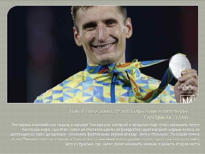 Павел Тимощенко, 29 лет. Современное пятиборье. Серебряная медаль Это первая олимпийская медаль в карьере Тимощенко, который в прошлом году сумел завоевать титул чемпиона мира. При этом Павел не считался одним из фаворитов соревнований. Борьба велась на дистанции из пяти дисциплин - плавания, фехтования, верховой езды, бега и стрельбы. По общей сумме очков Тимощенко стал вторым, а вырваться на призовое место удалось за счет удачных выступлений в беге и стрельбе, где Павел сумел избежать ошибок и добыть второе место.