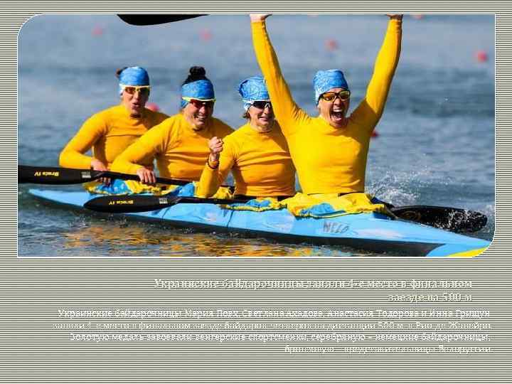Украинские байдарочницы заняли 4 -е место в финальном заезде на 500 м Украинские байдарочницы Мария Повх, Светлана Ахадова, Анастасия Тодорова и Инна Грищун заняли 4 -е место в финальном заезде байдарок-четверок на дистанции 500 м в Рио-де-Жанейро. Золотую медаль завоевали венгерские спортсменки, серебряную – немецкие байдарочницы, бронзовую – представительницы Белоруссии.