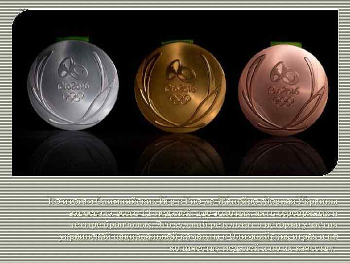 По итогам Олимпийских Игр в Рио-де-Жанейро сборная Украины завоевала всего 11 медалей: две золотых, пять серебряных и четыре бронзовых. Это худший результат в истории участия украинской национальной команды в Олимпийских играх и по количеству медалей и по их качеству.