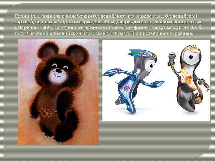 Принципы, правила и положения Олимпийских игр определены Олимпийской хартией, основы которой утверждены Международным спортивным конгрессом в Париже в 1894. Понятие олимпийский талисман официально утвердили в 1972 году. У каждой олимпийской игры свой талисман. И они совершенно разные.
