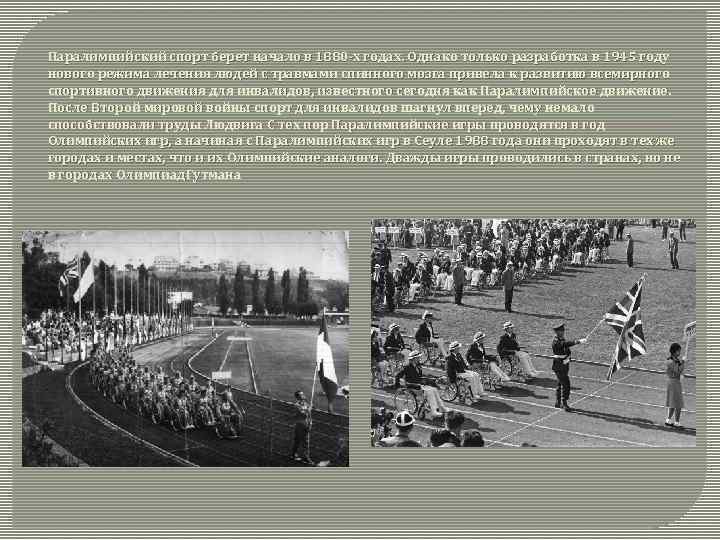 Паралимпийский спорт берет начало в 1880 -х годах. Однако только разработка в 1945 году нового режима лечения людей с травмами спинного мозга привела к развитию всемирного спортивного движения для инвалидов, известного сегодня как Паралимпийское движение. После Второй мировой войны спорт для инвалидов шагнул вперед, чему немало способствовали труды Людвига С тех пор Паралимпийские игры проводятся в год Олимпийских игр, а начиная с Паралимпийских игр в Сеуле 1988 года они проходят в тех же городах и местах, что и их Олимпийские аналоги. Дважды игры проводились в странах, но не в городах Олимпиад. Гутмана