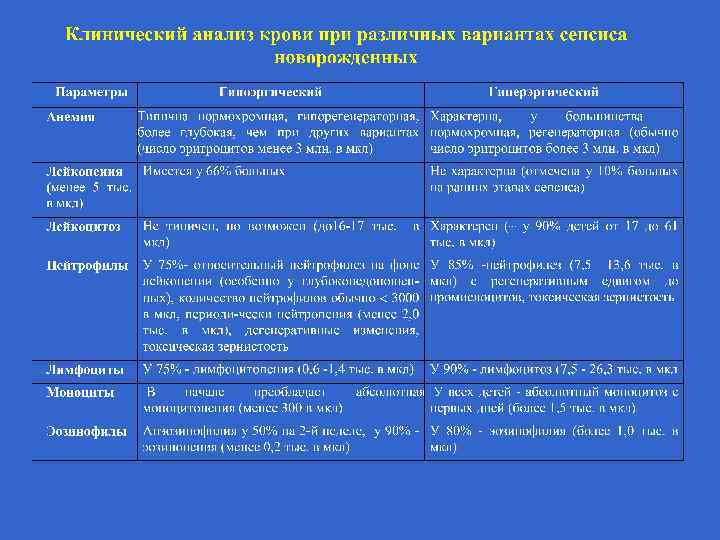 Лабораторные признаки SIRS у новорожденных: 1. Внезапно возникший тяжелый метаболический лактат-ацидоз с гипокапнией (последнее при отсутствии поражения легких) 2. Лейкоцитоз (кол-во лейкоцитов у детей первого дня жизни >30000, 2 -7 дней >15000 и старше >12000 в 1 мкл капиллярной крови) или лейкопения (кол-во лейкоцитов в 1 мкл крови <6000 и далее <5000) с нейтрофилезом (количество нейтрофилов в 1 мкл капиллярной крови у детей первого дня жизни >15000 2 -7 дней >7500 и 8 дней и старше > 6500) или нейтропения (соответственно в указанные выше дни число нейтрофилов <5000 2000, и 1750)