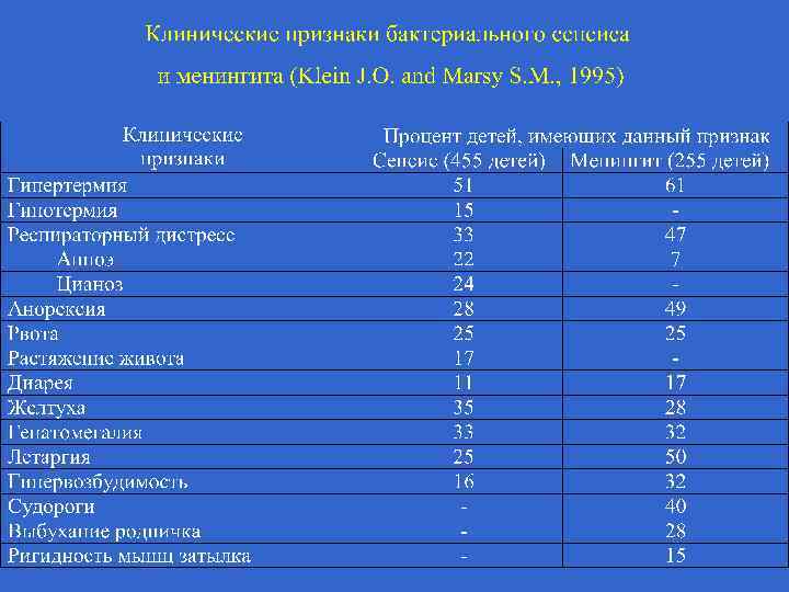 Симпоматика, ассоциированная со стрептококковой В-инфекцией (Хилл Х. , 1995) Признаки Раннее начало Позднее начало Лихорадка 30 - 40 80 - 90 Желтуха 15 - 20 Кома 50 - 60 20 - 25 Выбухание родничка 5 - 10 60 - 70 30 80 Положительные культуры, % 20 - 30 80 - 90 Цереброспинальная жидкость 20 - 30 80 - 90 Кровь 80 - 90 90 - 95 Другие места 85 - 90 10 - 15 Летальность, % 30 - 50 15 - 20 - 50 Менингит Неврологические последствия, %
