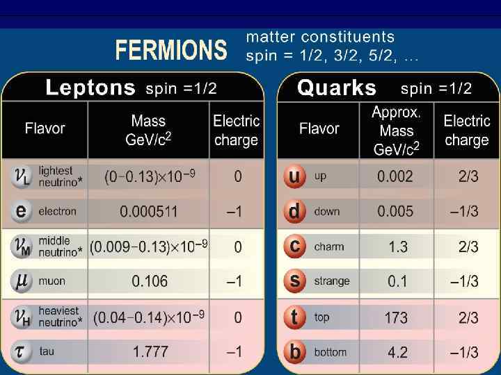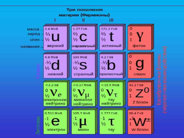 Всё вещество состоит из 24 фундаментальных квантовых полей спина ½, квантами которых являются фундаментальные частицы-фермионы, которые можно объединить в три поколения фермионов: 6 лептонов (электрон, мюон, тау-лептон, электронное нейтрино, мюонное нейтрино и тау-нейтрино), 6 кварков (u, d, s, c, b, t) и 12 соответствующих им античастиц.