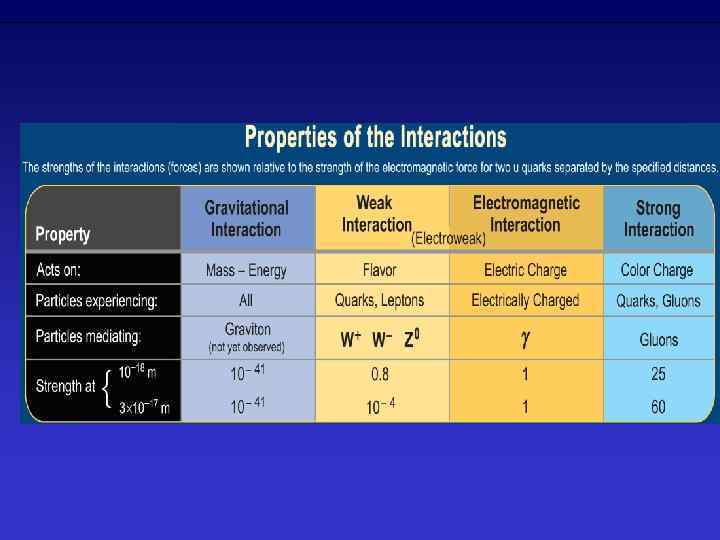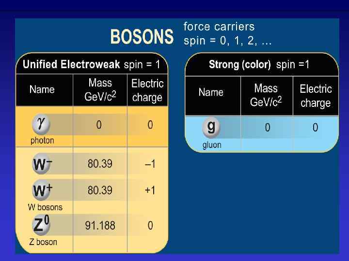 Частицами-переносчиками взаимодействий являются бозоны: 8 глюонов для сильного взаимодействия; 3 тяжёлых калибровочных бозона (W+, W−, Z 0) для слабого взаимодействия один фотон для электромагнитного взаимодействия. В отличие от электромагнитного и сильного, слабое взаимодействие может смешивать фермионы из разных поколений, что приводит к нестабильности всех частиц, за исключением легчайших, и к таким эффектам, как нарушение CP-инвариантности и нейтринные осцилляции.