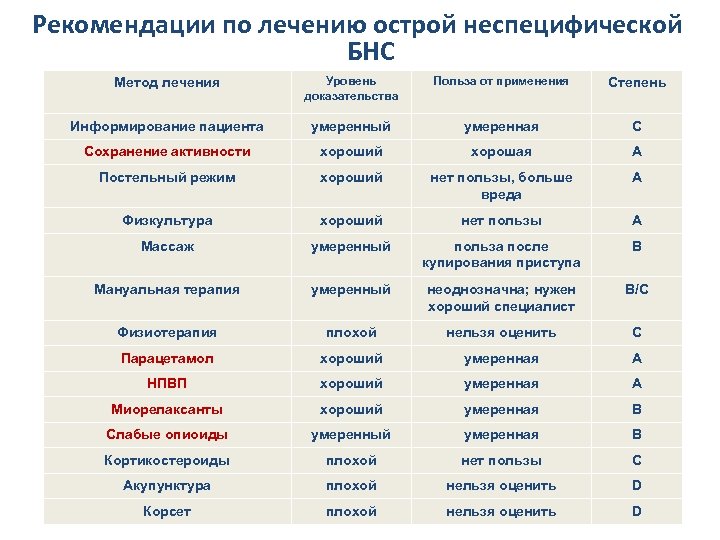 Рекомендации по лечению острой неспецифической БНС Метод лечения Уровень доказательства Польза от применения Степень Информирование пациента умеренный умеренная С Сохранение активности хороший хорошая А Постельный режим хороший нет пользы, больше вреда А Физкультура хороший нет пользы А Массаж умеренный польза после купирования приступа В Мануальная терапия умеренный неоднозначна; нужен хороший специалист В/С Физиотерапия плохой нельзя оценить С Парацетамол хороший умеренная А НПВП хороший умеренная А Миорелаксанты хороший умеренная В Слабые опиоиды умеренный умеренная В Кортикостероиды плохой нет пользы С Акупунктура плохой нельзя оценить D Корсет плохой нельзя оценить D