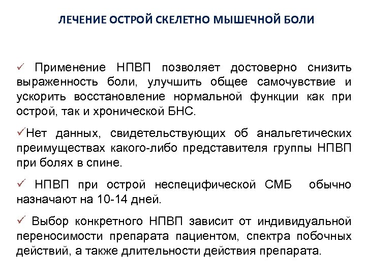 ЛЕЧЕНИЕ ОСТРОЙ СКЕЛЕТНО МЫШЕЧНОЙ БОЛИ ü Применение НПВП позволяет достоверно снизить выраженность боли, улучшить общее самочувствие и ускорить восстановление нормальной функции как при острой, так и хронической БНС. üНет данных, свидетельствующих об анальгетических преимуществах какого-либо представителя группы НПВП при болях в спине. ü НПВП при острой неспецифической СМБ назначают на 10 -14 дней. обычно ü Выбор конкретного НПВП зависит от индивидуальной переносимости препарата пациентом, спектра побочных действий, а также длительности действия препарата.
