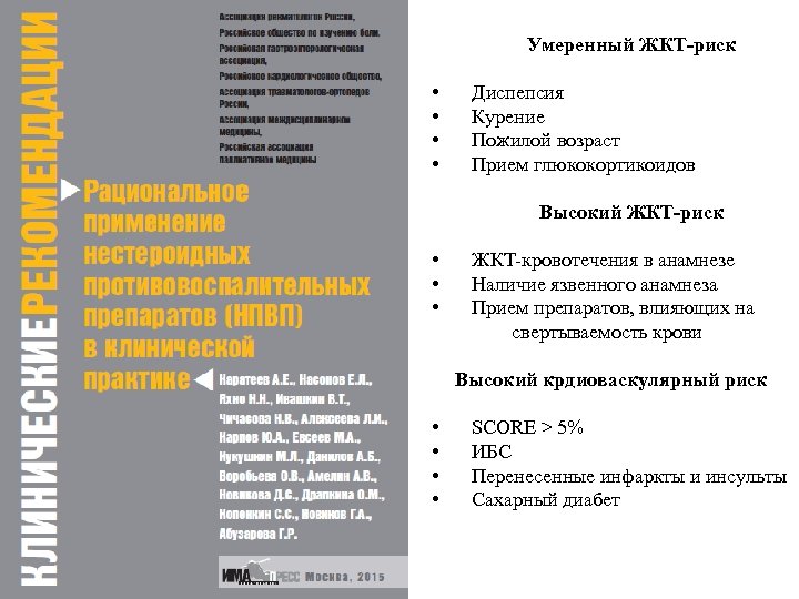 Умеренный ЖКТ-риск • • Диспепсия Курение Пожилой возраст Прием глюкокортикоидов Высокий ЖКТ-риск • • • ЖКТ-кровотечения в анамнезе Наличие язвенного анамнеза Прием препаратов, влияющих на свертываемость крови Высокий крдиоваскулярный риск • • SCORE > 5% ИБС Перенесенные инфаркты и инсульты Сахарный диабет