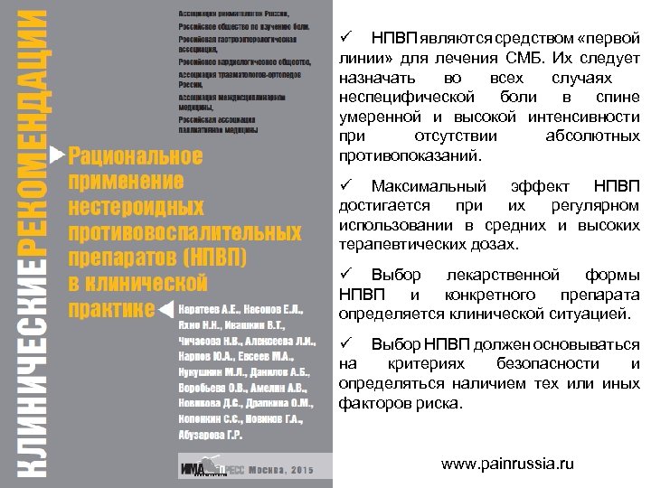 ü НПВП являются средством «первой линии» для лечения СМБ. Их следует назначать во всех случаях неспецифической боли в спине умеренной и высокой интенсивности при отсутствии абсолютных противопоказаний. ü Максимальный эффект НПВП достигается при их регулярном использовании в средних и высоких терапевтических дозах. ü Выбор лекарственной формы НПВП и конкретного препарата определяется клинической ситуацией. ü Выбор НПВП должен основываться на критериях безопасности и определяться наличием тех или иных факторов риска. www. painrussia. ru