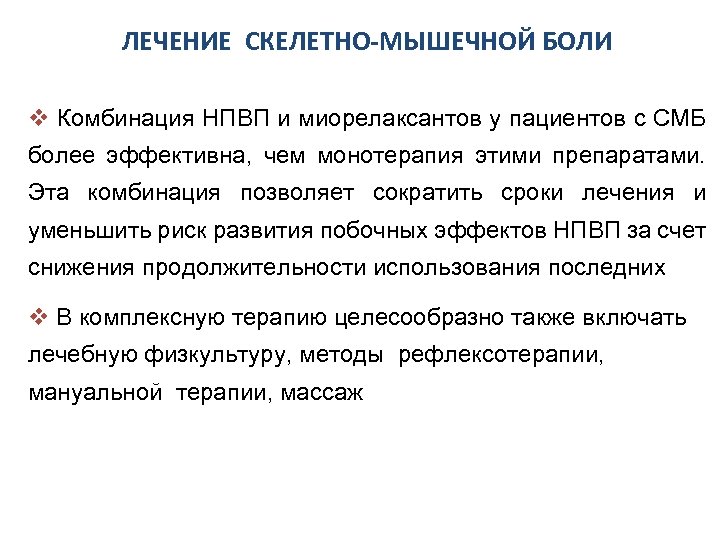 ЛЕЧЕНИЕ СКЕЛЕТНО-МЫШЕЧНОЙ БОЛИ v Комбинация НПВП и миорелаксантов у пациентов с СМБ более эффективна, чем монотерапия этими препаратами. Эта комбинация позволяет сократить сроки лечения и уменьшить риск развития побочных эффектов НПВП за счет снижения продолжительности использования последних v В комплексную терапию целесообразно также включать лечебную физкультуру, методы рефлексотерапии, мануальной терапии, массаж