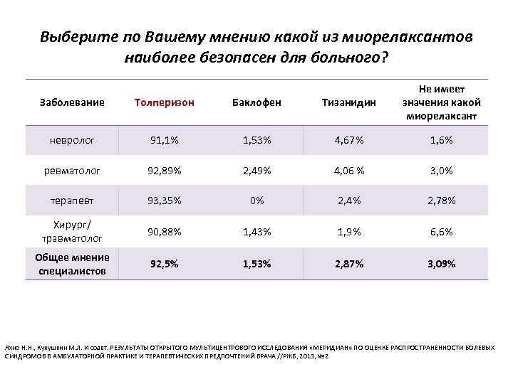 Выберите по Вашему мнению какой из миорелаксантов наиболее безопасен для больного? Заболевание Толперизон Баклофен Тизанидин Не имеет значения какой миорелаксант невролог 91, 1% 1, 53% 4, 67% 1, 6% ревматолог 92, 89% 2, 49% 4, 06 % 3, 0% терапевт 93, 35% 0% 2, 4% 2, 78% Хирург/ травматолог 90, 88% 1, 43% 1, 9% 6, 6% Общее мнение специалистов 92, 5% 1, 53% 2, 87% 3, 09% Яхно Н. Н. , Кукушкин М. Л. И соавт. РЕЗУЛЬТАТЫ ОТКРЫТОГО МУЛЬТИЦЕНТРОВОГО ИССЛЕДОВАНИЯ «МЕРИДИАН» ПО ОЦЕНКЕ РАСПРОСТРАНЕННОСТИ БОЛЕВЫХ СИНДРОМОВ В АМБУЛАТОРНОЙ ПРАКТИКЕ И ТЕРАПЕВТИЧЕСКИХ ПРЕДПОЧТЕНИЙ ВРАЧА //РЖБ, 2013, № 2