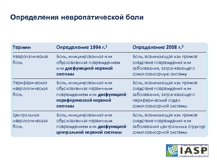 Определения невропатической боли Термин Определение 1994 г. 1 Определение 2008 г. 2 Невропатическая боль Боль, инициированная или обусловленная повреждением или дисфункцией нервной системы Боль, возникающая как прямое следствие повреждения или заболевания, затрагивающего соматосенсорную систему Периферическая невропатическая боль Боль, инициированная или обусловленная первичным повреждением или дисфункцией периферической нервной системы Боль, возникающая как прямое следствие повреждения или заболевания, затрагивающего периферический отдел соматосенсорной системы Центральная невропатическая боль Боль, инициированная или обусловленная первичным повреждением или дисфункцией центральной нервной системы Боль, возникающая как прямое следствие повреждения или заболевания центральных структур соматосенсорной системы ¹ «Part III: Pain Terms, A Current List with Definitions and Notes on Usage» (pp. 209 -214) Classification of Chronic Pain, Second Edition, IASP Task Force on Taxonomy, edited by H. Merskey and N. Bogduk, IASP Press, Seattle, © 1994 ² IASP Council in Kyoto, November 29 -30, 2007