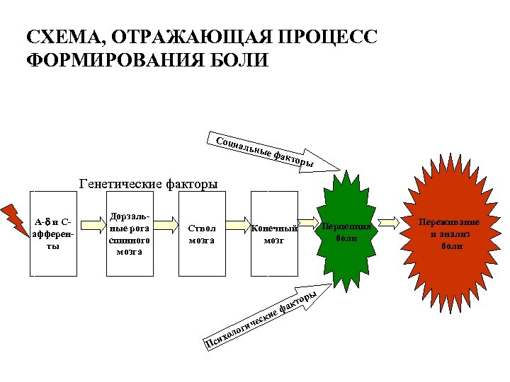 СХЕМА, ОТРАЖАЮЩАЯ ПРОЦЕСС ФОРМИРОВАНИЯ БОЛИ Соци а льны е фак торы Генетические факторы А-d и Сафференты Дорзальные рога спинного мозга Ствол мозга Перцепция боли Конечный мозг ры о ие еск гич П ол сих ф о акт Переживание и анализ боли