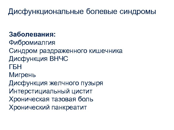 ПСИХОГЕННЫЕ (ДИСФУНКЦИОНАЛЬНЫЕ) БОЛЕВЫЕ СИНДРОМЫ • Боли, обусловленные мышечным перенапряжением и провоцируемые эмоциональными факторами • Боли как бред или галлюцинация у пациентов с психозами, исчезающие при лечении основного заболевания • Боли при истерии и ипохондрии, не имеющие соматической основы • Боли, связанные с депрессией, не предшествующие ей и не имеющие какой-либо другой причины