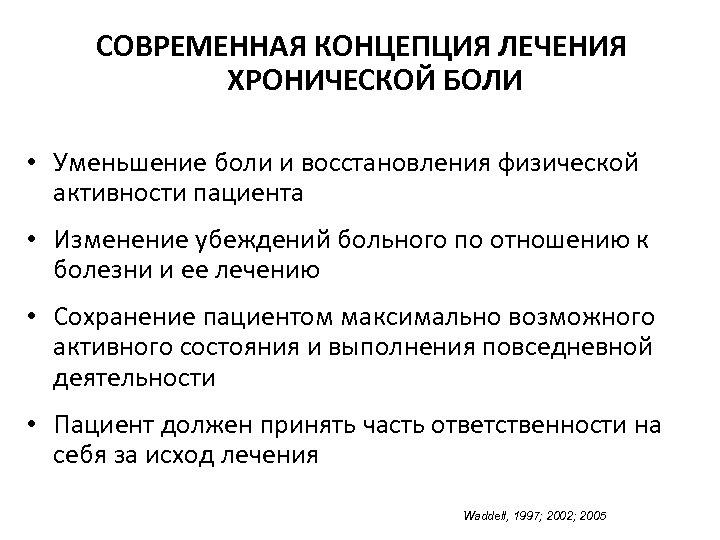 СОВРЕМЕННАЯ КОНЦЕПЦИЯ ЛЕЧЕНИЯ ХРОНИЧЕСКОЙ БОЛИ • Уменьшение боли и восстановления физической активности пациента • Изменение убеждений больного по отношению к болезни и ее лечению • Сохранение пациентом максимально возможного активного состояния и выполнения повседневной деятельности • Пациент должен принять часть ответственности на себя за исход лечения Waddell, 1997; 2002; 2005