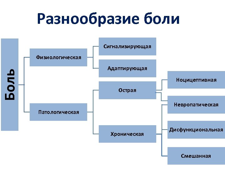 Разнообразие боли Сигнализирующая Физиологическая Боль Адаптирующая Ноцицептивная Острая Невропатическая Патологическая Хроническая Дисфункциональная Смешанная