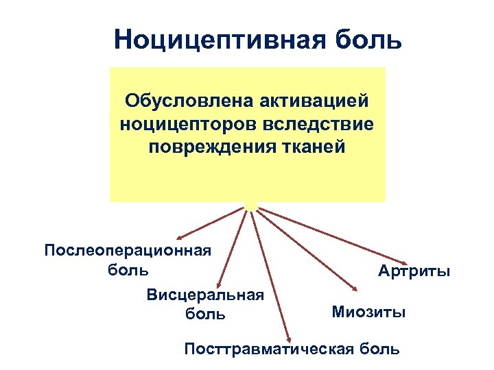 Ноцицептивная боль Обусловлена активацией ноцицепторов вследствие повреждения тканей Послеоперационная боль Висцеральная боль Артриты Миозиты Посттравматическая боль