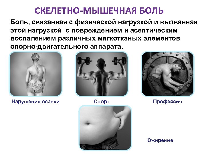 СКЕЛЕТНО-МЫШЕЧНАЯ БОЛЬ Боль, связанная с физической нагрузкой и вызванная этой нагрузкой с повреждением и асептическим воспалением различных мягкотканых элементов опорно-двигательного аппарата. Нарушения осанки Спорт Профессия Ожирение