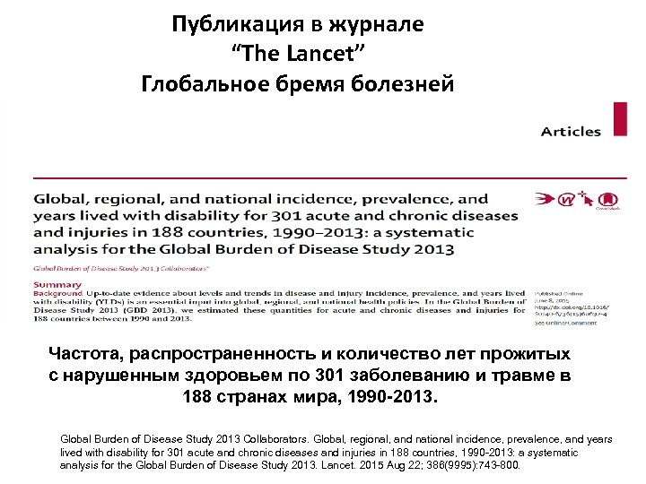 Публикация в журнале “The Lancet” Глобальное бремя болезней Частота, распространенность и количество лет прожитых с нарушенным здоровьем по 301 заболеванию и травме в 188 странах мира, 1990 -2013. Global Burden of Disease Study 2013 Collaborators. Global, regional, and national incidence, prevalence, and years lived with disability for 301 acute and chronic diseases and injuries in 188 countries, 1990 -2013: a systematic analysis for the Global Burden of Disease Study 2013. Lancet. 2015 Aug 22; 386(9995): 743 -800.