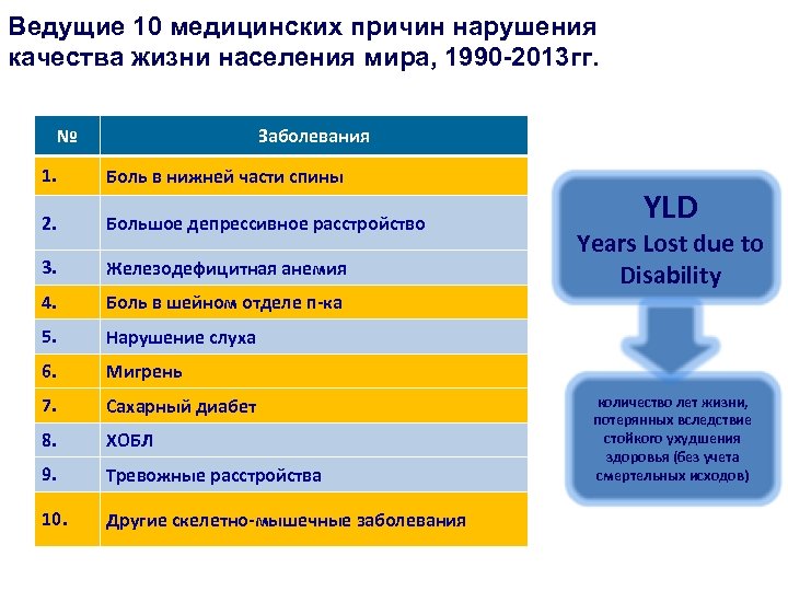 Ведущие 10 медицинских причин нарушения качества жизни населения мира, 1990 -2013 гг. № Заболевания 1. Боль в нижней части спины 2. Большое депрессивное расстройство 3. Железодефицитная анемия 4. Боль в шейном отделе п-ка 5. Нарушение слуха 6. Мигрень 7. Сахарный диабет 8. ХОБЛ 9. Тревожные расстройства 10. Другие скелетно-мышечные заболевания YLD Years Lost due to Disability количество лет жизни, потерянных вследствие стойкого ухудшения здоровья (без учета смертельных исходов)