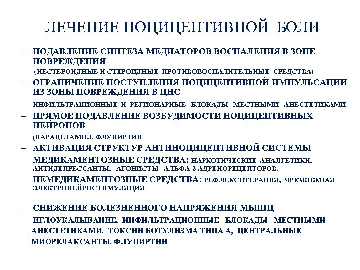 ЛЕЧЕНИЕ НОЦИЦЕПТИВНОЙ БОЛИ – ПОДАВЛЕНИЕ СИНТЕЗА МЕДИАТОРОВ ВОСПАЛЕНИЯ В ЗОНЕ ПОВРЕЖДЕНИЯ (НЕСТЕРОИДНЫЕ И СТЕРОИДНЫЕ ПРОТИВОВОСПАЛИТЕЛЬНЫЕ СРЕДСТВА) – ОГРАНИЧЕНИЕ ПОСТУПЛЕНИЯ НОЦИЦЕПТИВНОЙ ИМПУЛЬСАЦИИ ИЗ ЗОНЫ ПОВРЕЖДЕНИЯ В ЦНС ИНФИЛЬТРАЦИОННЫЕ И РЕГИОНАРНЫЕ БЛОКАДЫ МЕСТНЫМИ АНЕСТЕТИКАМИ – ПРЯМОЕ ПОДАВЛЕНИЕ ВОЗБУДИМОСТИ НОЦИЦЕПТИВНЫХ НЕЙРОНОВ (ПАРАЦЕТАМОЛ, ФЛУПИРТИН – АКТИВАЦИЯ СТРУКТУР АНТИНОЦИЦЕПТИВНОЙ СИСТЕМЫ МЕДИКАМЕНТОЗНЫЕ СРЕДСТВА: НАРКОТИЧЕСКИЕ АНАЛГЕТИКИ, АНТИДЕПРЕССАНТЫ, АГОНИСТЫ АЛЬФА-2 -АДРЕНОРЕЦЕПТОРОВ. НЕМЕДИКАМЕНТОЗНЫЕ СРЕДСТВА: РЕФЛЕКСОТЕРАПИЯ, ЧРЕЗКОЖНАЯ ЭЛЕКТРОНЕЙРОСТИМУЛЯЦИЯ - СНИЖЕНИЕ БОЛЕЗНЕННОГО НАПРЯЖЕНИЯ МЫШЦ ИГЛОУКАЛЫВАНИЕ, ИНФИЛЬТРАЦИОННЫЕ БЛОКАДЫ МЕСТНЫМИ АНЕСТЕТИКАМИ, ТОКСИН БОТУЛИЗМА ТИПА А, ЦЕНТРАЛЬНЫЕ МИОРЕЛАКСАНТЫ, ФЛУПИРТИН