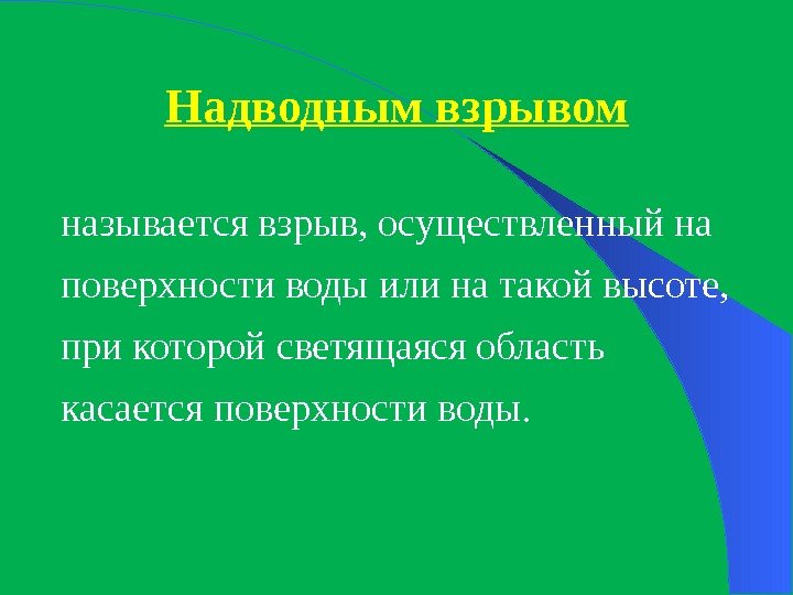 называется взрыв, осуществленный на поверхности воды или на такой высоте, при которой светящаяся область касается поверхности воды. Надводным взрывом